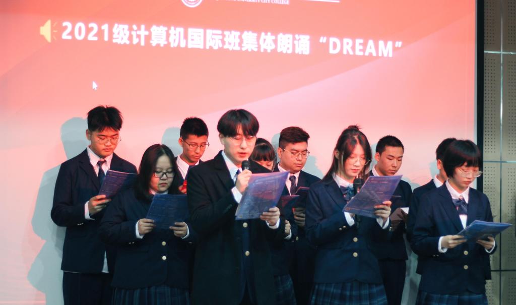 2021级国际班学生集体表演了英文歌曲和英文诗朗诵,展现出大一学子们朝气蓬勃的青春风采。