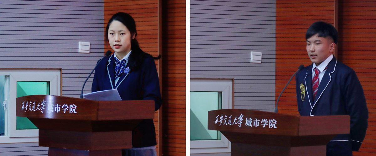 2020级国际班学生代表刘俞欣和周仪文用中英双语进行了主题发言,表达了对国际班大家庭的热爱和学院提供高质量学习环境的感谢。