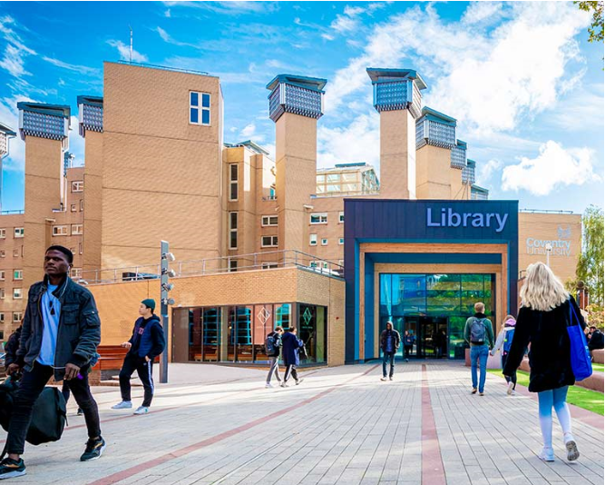 考文垂大学图书馆是英国最现代化的图书馆之一,按环保高标准设计投资2亿元的考文垂大学新图书馆2000年夏已投入使用。它是考文垂大学及英国中部地区的重要资源中心。考文垂图书馆藏书逾300000册,期刊达2600多种,馆内建立有一系列电脑工作站。提供UNIX服务、个人电脑N局域网以及五座高性能NXT工作站为基础的电脑服务为学生进行学习与研究提供了多种便利。
