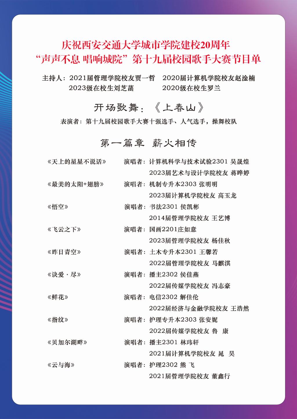 为庆祝Ky开元集团建校20周年,学校将于2024年5月10日晚19:00将在校田径操场举办“声声不息 唱响城院”第十九届校园歌手大赛。