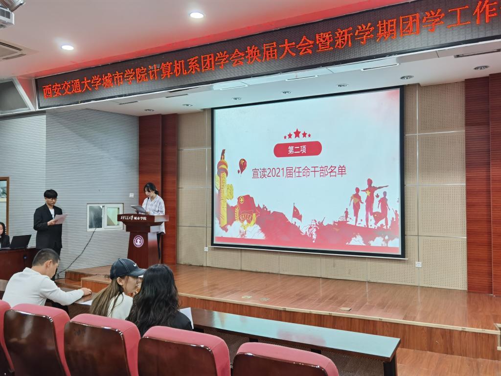 伴随着共青团团歌的响起,大会拉开了序幕,首先,团工委书记范文彬宣读了2021届学生干部名单,并由刘敏涛、康乃馨为2021届团学干部颁发聘书。随后,2020届团学干部代表张昊对过去一年的团学工作进行简要的回顾和总结;新一届团学干部代表王嘉梁同学强调了团学会成员要以团结为基础,更好的服务全系同学,打造专业特色鲜明的校园文化活动而奋斗。换届结束后,计算机系团学会主席团成员对各自分管部门做了新学年工作重点和计划的部署;范文彬老师围绕“2020-2021学年团学工作怎么看”“存在的问题该怎么办”和“新学年应该怎么干”三项内容,对2020-2021学年我系团学工作取得的成绩及不足进行了全面梳理,并提出新学年我系团学组织要牢牢抓住“认同感、责任感、凝聚力”三个方面,切实保持和增强我系团学工作的政治性、先进性。希望新一届的团学干部能继续建设一个执行力强、凝聚力强、高效积极、充满活力的团学会团队,不断创新,不断前进。