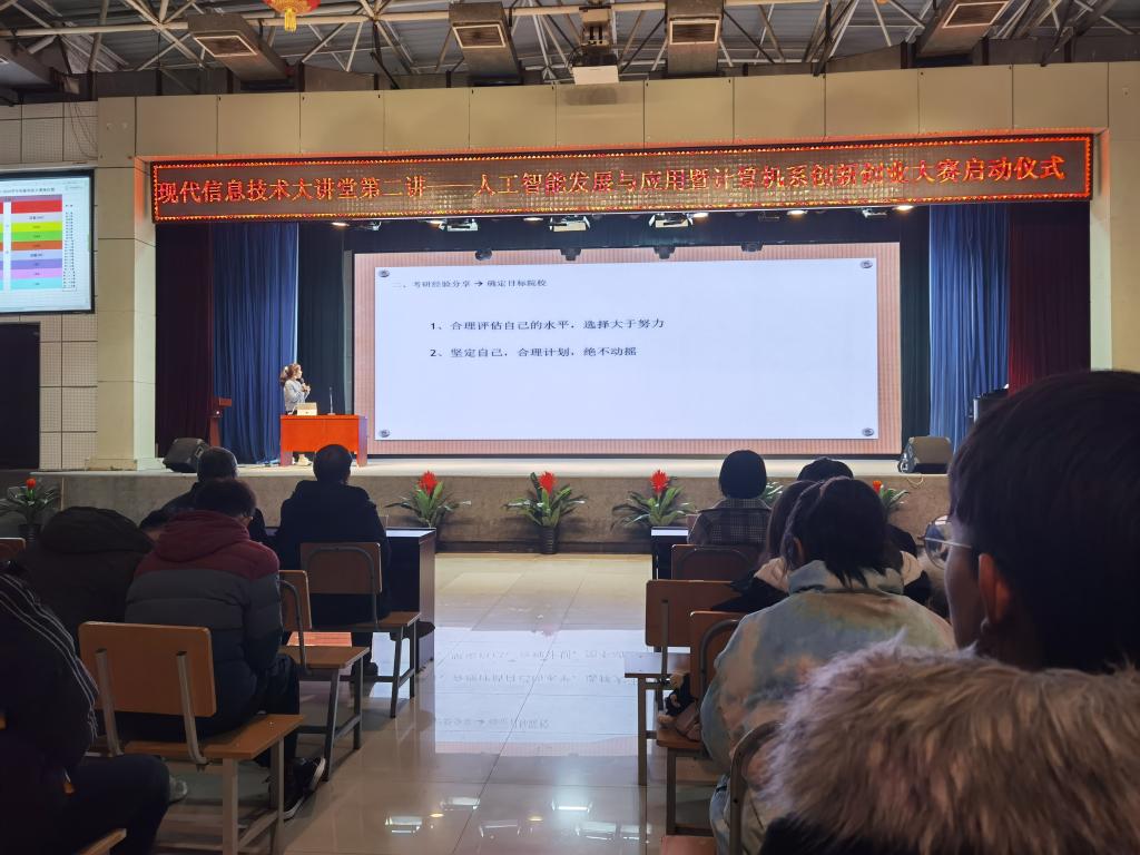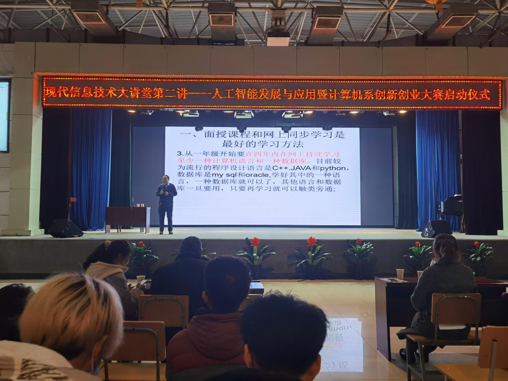 为响应学院第九届“我敢闯,我会创”创新创业大赛的开展,引导、鼓励广大学生踊跃参加各类型的创新创业活动,切实培养和提升计算机系学生专业学习能力,我系于12月2日晚在大学生活动中心举办计算机系创新创业大赛启动仪式暨现代信息技术大讲堂活动。本次大会邀请到西安理工大学Ky开元集团张璟教授为主讲、优秀毕业生淡玉瑞、计算机系主任缪相林以及学工办辅导员到场参会,系创新创业负责人范文彬主持本次会议。
