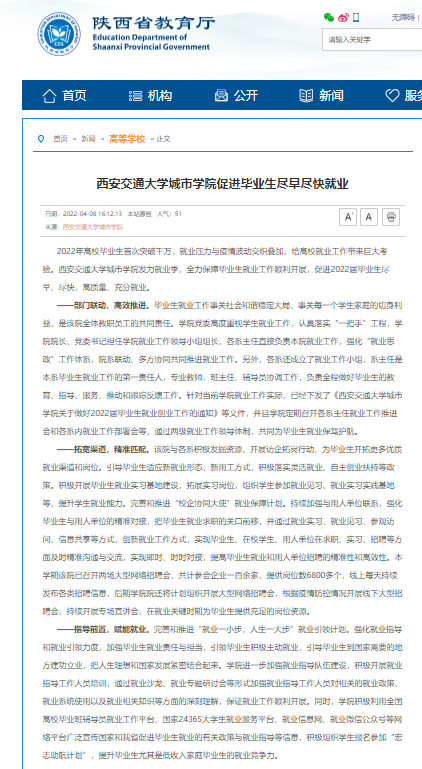 近日,陕西省教育厅官网报道了学院就业情况。具体链接及内容如下: