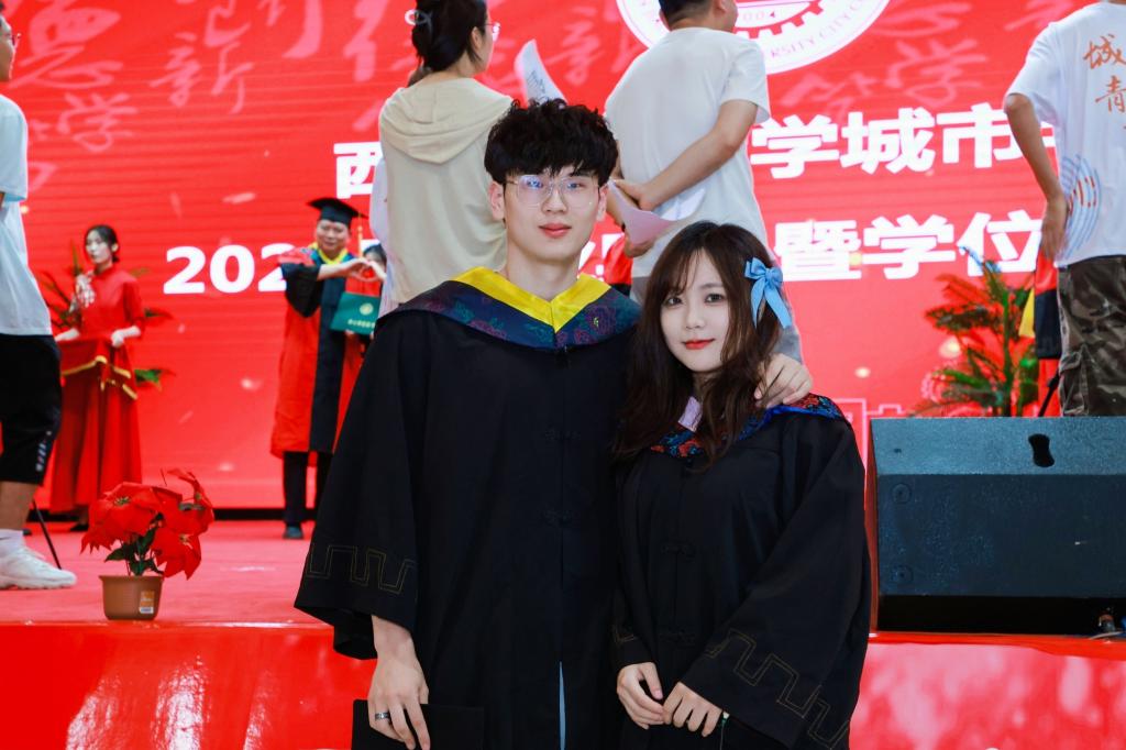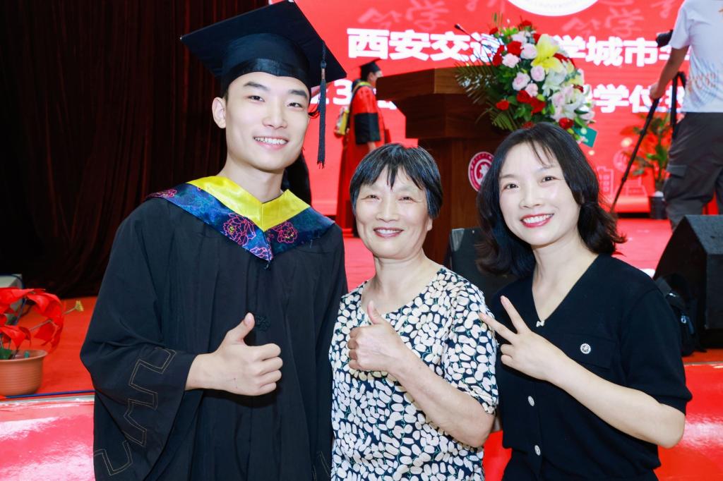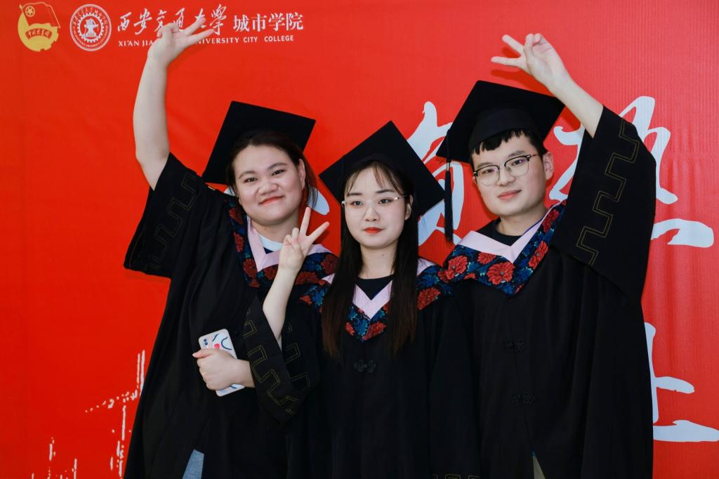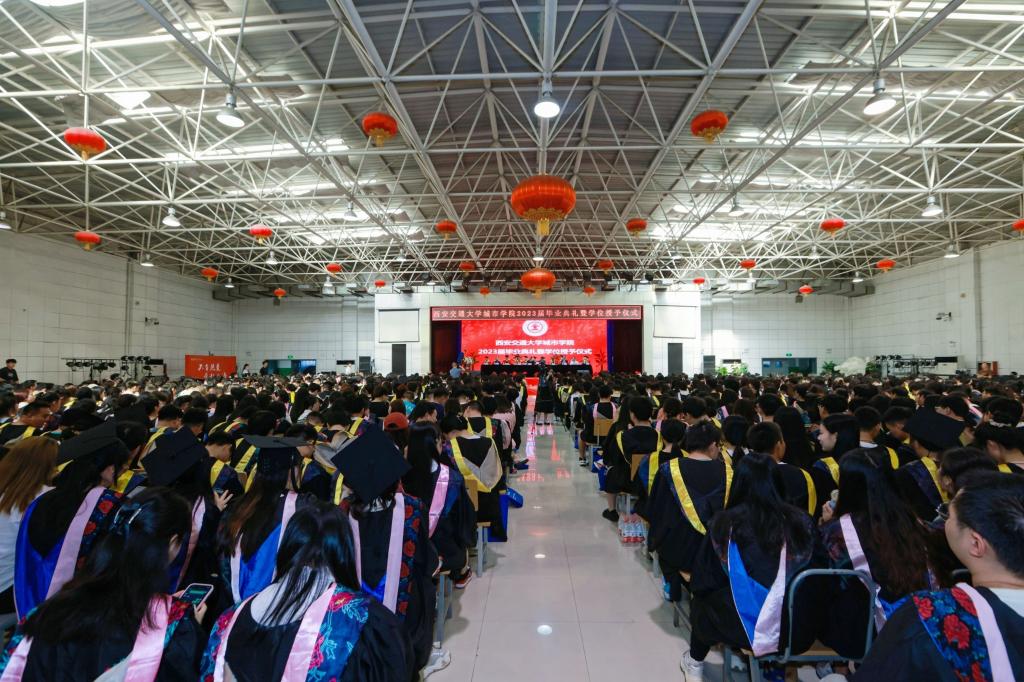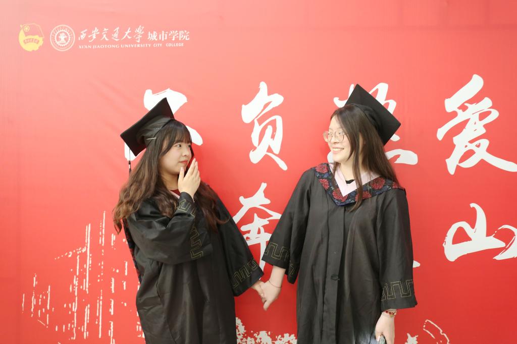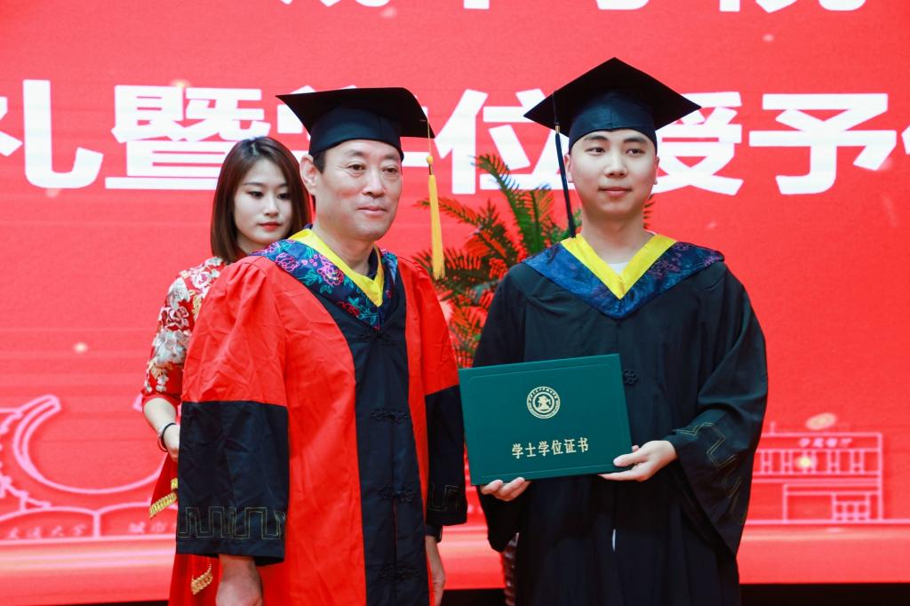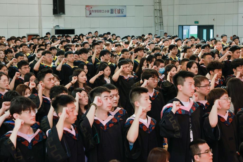 在管理系工商191班杨斯民同学、外语系英语194班郗悦靓同学的带领下,全体毕业生集体进行宣誓:铭记尚德笃学,坚持守正创新;感恩父母养育,谨遵师长教诲;勇担时代使命,争做社会精英;肩负公民责任,报效祖国人民;为国家繁荣富强努力奋斗,让明日的交大城院以我为荣!毕业生们声音洪亮,场面庄严而隆重。