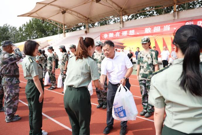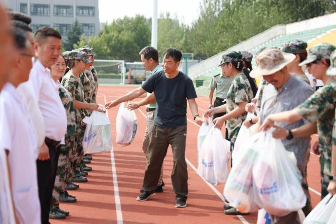在一阵阵掌声中,学校领导、老师为军训教官、指导员、参训学员及后勤保障服务代表发放了慰问品。