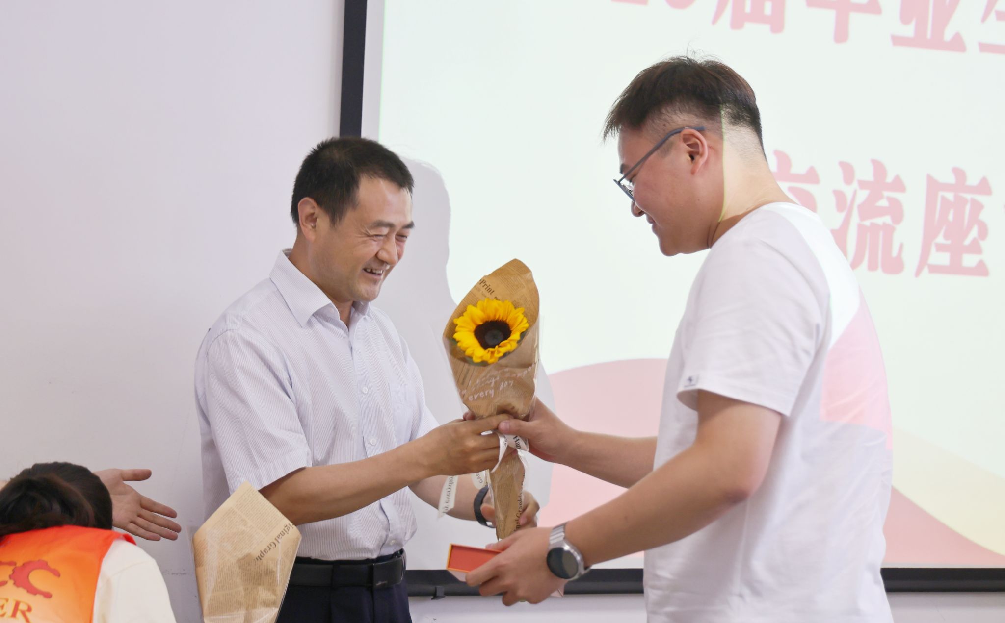 党委书记严红昌和党委副书记、副校长陈书荣代表学校为毕业生送上向日葵花束和定制文创礼盒,祝福毕业生们向阳而生、追光而行。毕业生们也准备了书法作品,祝愿母校“桃李不言,下自成蹊”。