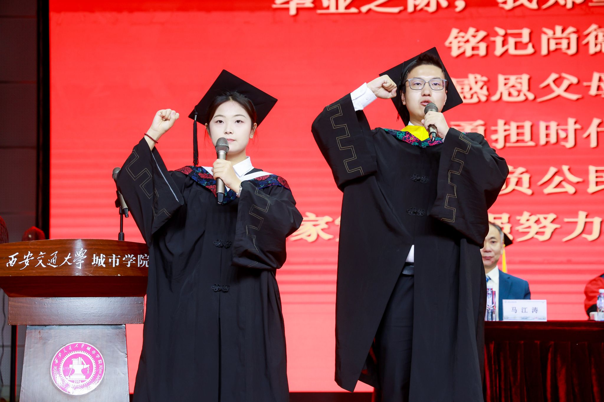 在Ky开元集团物联网2101班熊晨、护理与康复学院护理2102班王欣同学的带领下,全体毕业生进行宣誓。