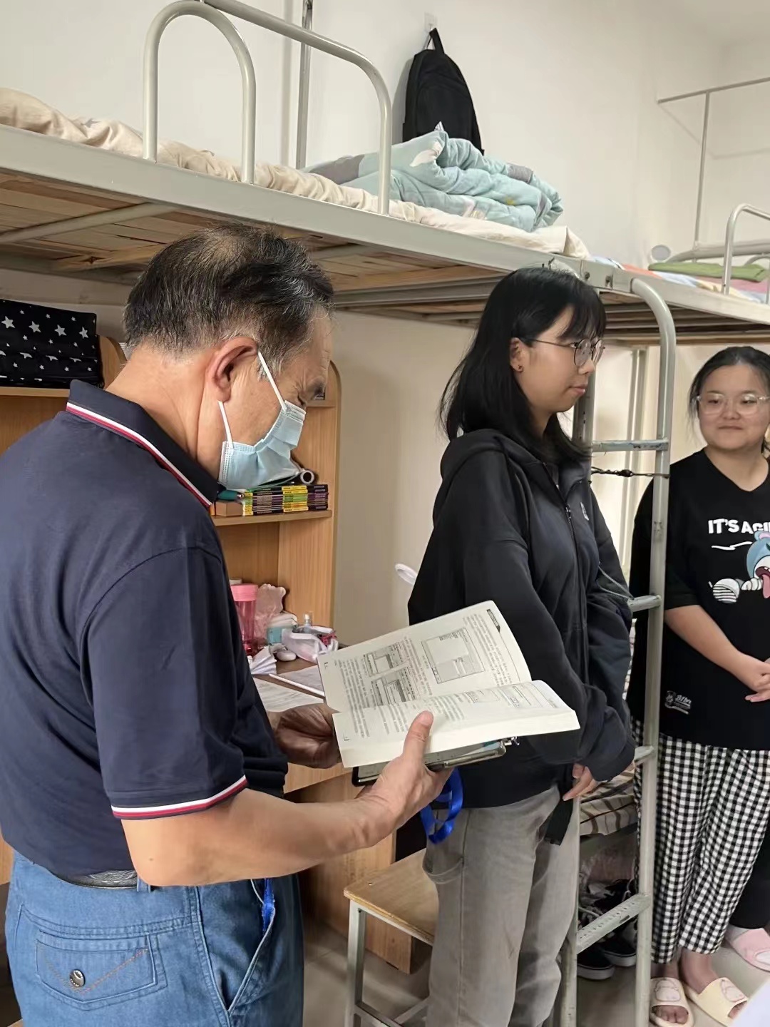 走访过程中,老师们亲切地与新生进行交谈,细心询问入学后的住宿、就餐和生活用品等问题,并仔细查看宿舍的各种设施是否完善。缪老师询问了新生生源地,了解了各地同学对于学校饮食居住的适应程度。他提出,新生同学们来自五湖四海,有缘齐聚一堂,要珍惜彼此之间的友谊,相互包容、互相理解。缪老师还特别提醒同学们注意宿舍的财产安全和用电安全,提高安全意识,如遇到困难和问题及时向辅导员老师和公寓管理员反映,舍友间齐心协力共同营造良好的住宿环境、学习氛围。