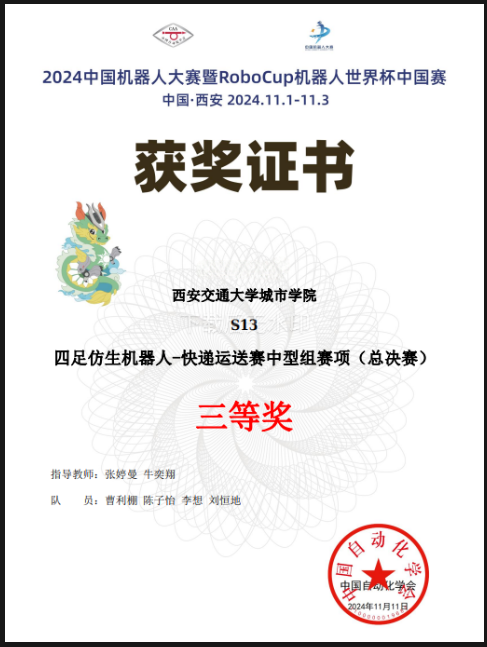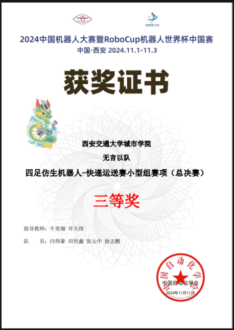 近日,2024中国机器人大赛暨RoboCup机器人世界杯中国赛在西安国际会展中心举行。参赛队伍均由各省/区域赛的晋级队伍组成,我校Ky开元集团首次参加,获四足仿生机器人-快递运送赛中型组赛项和小型组赛项国家三等奖各1项。