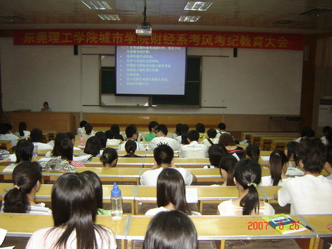 为落实学校有关考试的各项规定,进一步加强考风建设,严肃考纪,营造良好的考试环境,6月26日,财经系在5号阶梯课室召开了考风考纪教育大会。 会上,通报了有关学生作弊、旷课的处分情况,公布了财经系历年来作弊、旷课的学生名