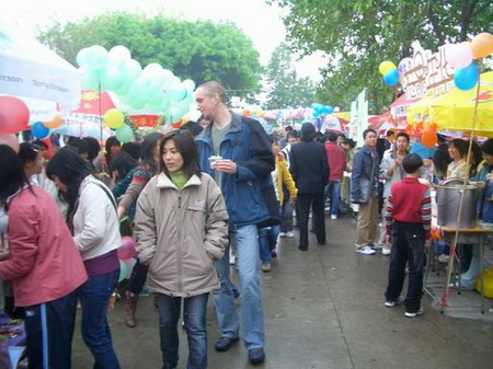 美食当前,如何抵挡 下午两点半,活动正式开始。整个活动场地已被同学们装饰得格外亮丽。气球是必不可少的装饰品,彩绸、彩灯、各具特色的招牌也让场地增色不少。什么“计信系美食街”、“财经步行街”、“国色天香”、“如果‘爱