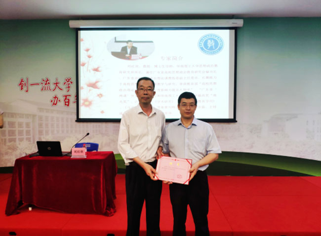 广东省高校思想政治教育研究会副理事长、华南理工大学博士生导师刘社欣教授应邀担任主讲嘉宾,深刻解读了习近平总书记在学校思想政治理论课教师座谈会上的重要讲话精神。他阐述了思政课特殊的教学要求和思政课教师的“强、深、新、广、严、正”的特殊要求。思政课教师要研究规律和遵循规律,要发现问题和直面问题,要内容创新和形式创新,推动思政课建设内涵式发展。