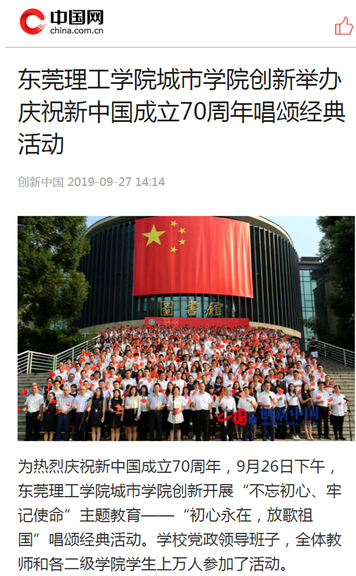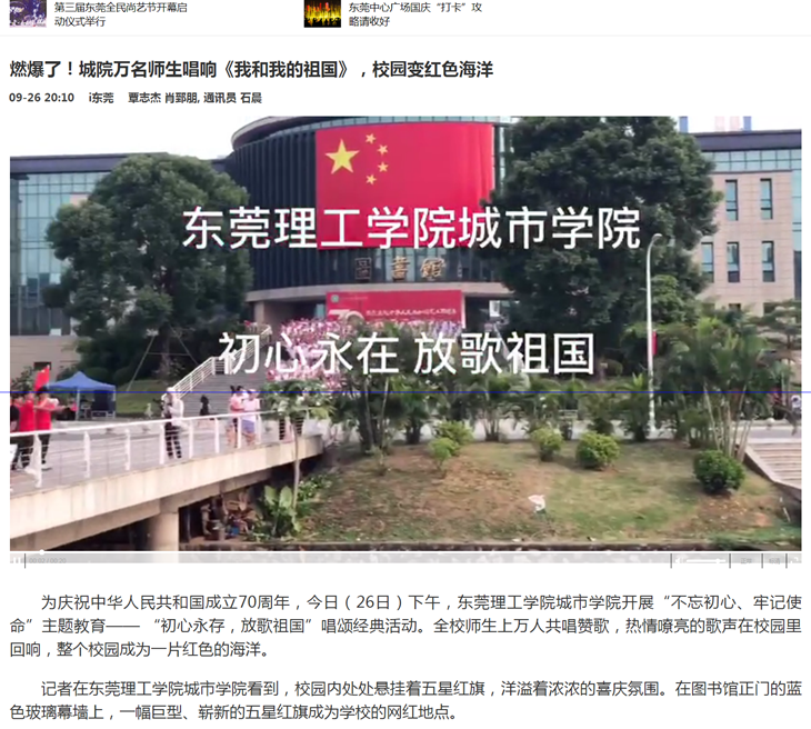 9月27日,中国网以《东莞理工学院城市学院创新举办庆祝新中国成立70周年唱颂经典活动》为题,进行了长篇报道。广东省教育厅网站在“广东教育”栏目以《“初心永在,放歌祖国”:东莞理工学院城市学院万名师生唱响经典红歌》为题,对活动进行了大篇幅的报道。
