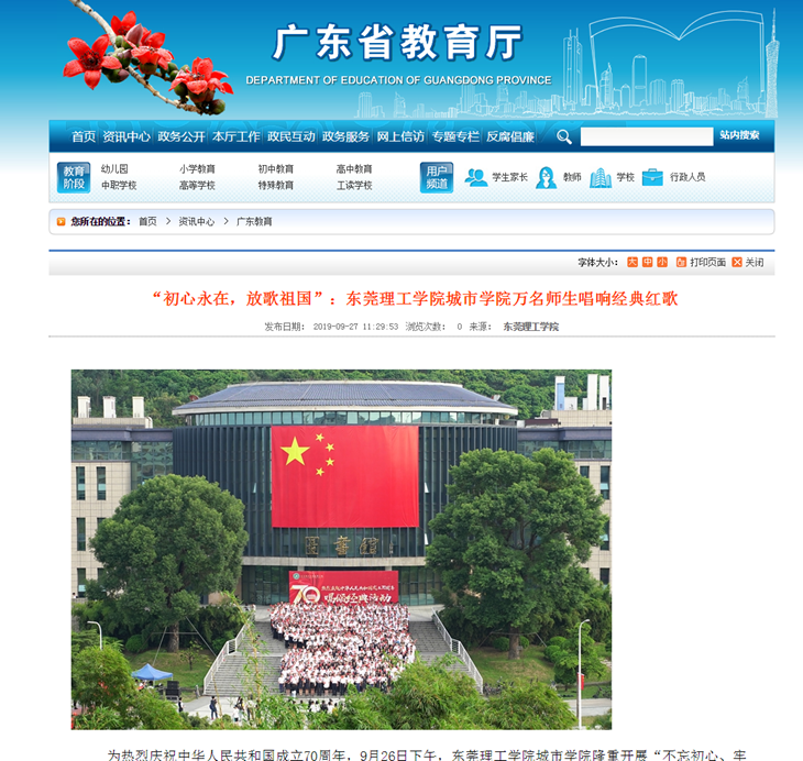 9月26日,为热烈庆祝中华人民共和国成立70周年,伟德官网成功开展“不忘初心、牢记使命”主题教育—— “初心永在,放歌祖国”唱颂经典活动。活动不仅在全校师生中赢得了广泛好评,连日来,中国网、广东省教育厅网站、羊城晚报、南方日报、广州日报、东莞日报等中央、省市媒体进行了广泛报道,获得了社会各届的点赞和热议!
