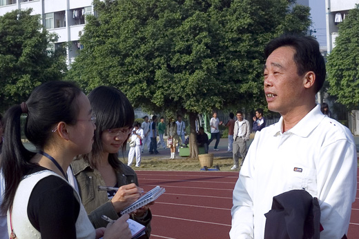 谈到开幕式,朱书记兴奋之情溢于言表。他说,本届运动会的开幕式匠心独运,规模庞大,各个代表队准备充分且很有创新思维。社科系承载着中华文化传统和激越奥林匹克精神“舞动北京”的标语牌;文学与艺系 “同一个世界,同一个梦想”的五彩花环与 “全民健身,与奥运同行!”的理念很好地结合在一起;嘉年华表演形式多样,精彩纷呈;花车环道的表演更是将和谐与创新完美的结合到了一起。朱书记认为,师生员工,不分职位高低,在同一起跑线上共同参与竞技运动,和谐、和睦、和顺的氛围遍布运动场上的每一个角落。