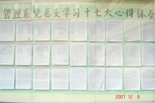 为了深入宣传贯彻十七大精神,管理系党总支将15名教师党员和17名学生党员学习十七大文件的心得体会,在系宣传栏里展出,供全系党员学习交流。
