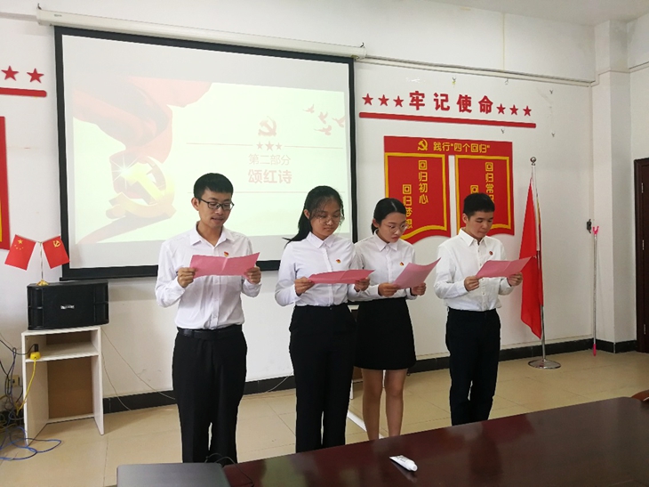 金融与贸易学院学生党支部举办了以“颂红诗,扬青春,筑党魂”为主题的党日活动。学生党员代表用真切的情感昂扬的斗志诵读《我爱你,祖国》《我骄傲,我是中国人》《我们都是追梦人》诗歌,表达了对党的忠诚和信仰,对祖国的热爱。还结合自身学习、生活和诵读感受,围绕“不忘初心、牢记使命”畅谈体会和感悟,探讨如何守初心,担使命。