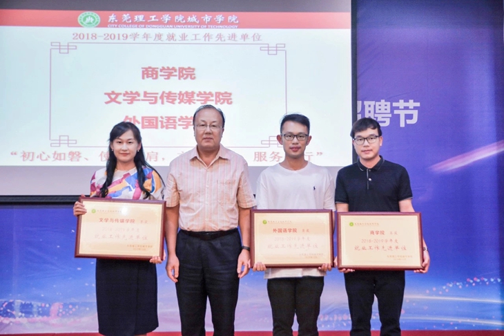 孔增强处长主持了会议,并宣读关于表彰2018-2019学年度就业工作先进单位、先进工作者的决定。章德胜书记、黄兢副校长分别为受表彰的先进单位和个人进行了颁奖。