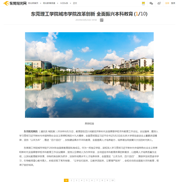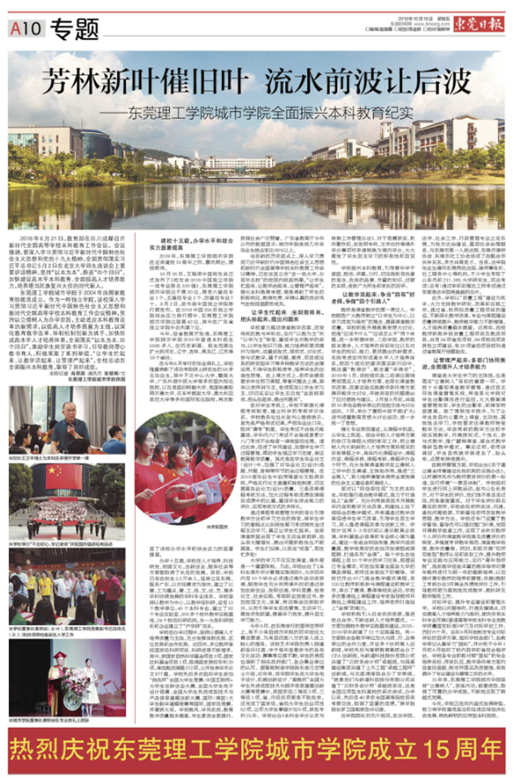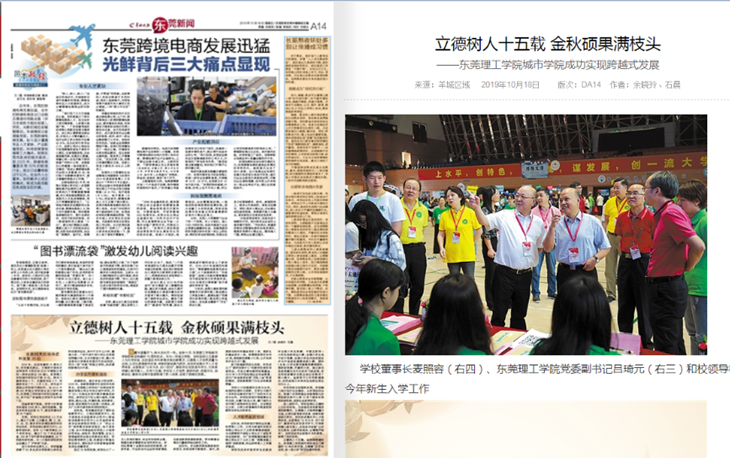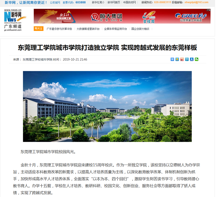 金秋十月,伟德官网喜迎建校15周年校庆。15年的优异办学成绩和卓越的表现,受到到中央、省市新闻媒体的积极关注和宣传报道。10月18日-21日,新华网发布了《东莞理工学院城市学院打造独立学院实现跨越式发展的东莞样板》、中国网发布了《东莞理工学院城市学院改革创新全面振兴本科教育》,羊城晚报发表了《立德树人十五载 金秋硕果满枝头——东莞理工学院城市学院成功实现跨越式发展》,东莞日报刊发了5000多字的长篇通讯《芳林新叶催旧叶 流水前波让后波——东莞理工学院城市学院全面振兴本科教育纪实》,对伟德官网“改革创新全面振兴本科教育”“打造独立学院实现跨越式发展的东莞样板”的办学经验和成绩进行了大篇幅的报道。