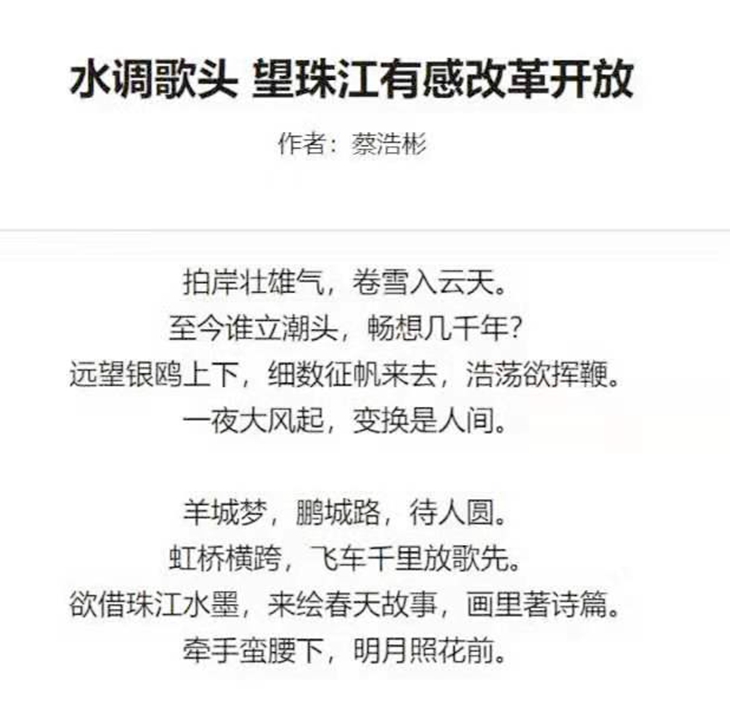 此次赛事是由教育部、国家语委主办,活动主题为“诵古今经典、写华夏文明、讲中国故事”,诗文创作大赛是其中一项重要的全国性比赛。历时6个月的多个评审环节,蔡浩彬同学的《水调歌头•望珠江有感改革开放》脱颖而出,获得大赛一等奖。