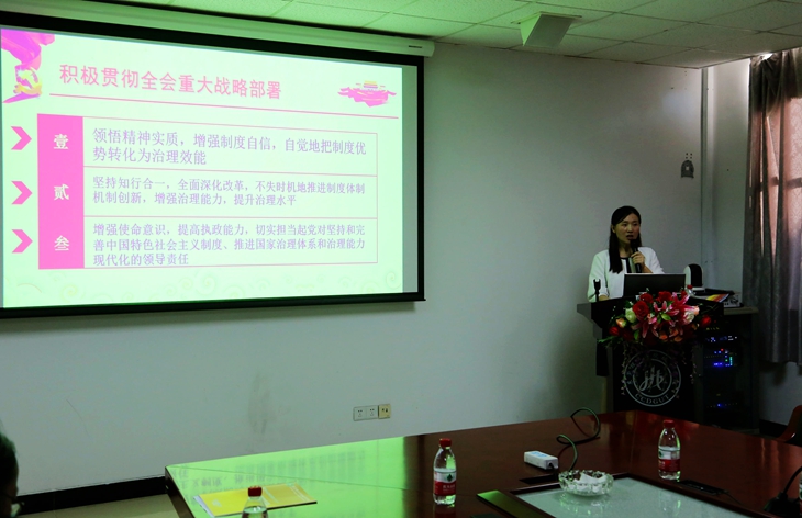马克思主义学院直属支部书记史雍真作了党的十九届四中全会精神宣讲。全面介绍了党的十九届四中全会,阐述了其重大意义。她通过三个“一”、13个显著优势、13个“坚持和完善”、落实四件大事等关键词,带领大家深刻领悟《中共中央关于坚持和完善中国特色社会主义制度、推进国家治理体系和治理能力现代化若干重大问题的决定》的重要精神,并积极贯彻十九届四中全会的重大战略部署。