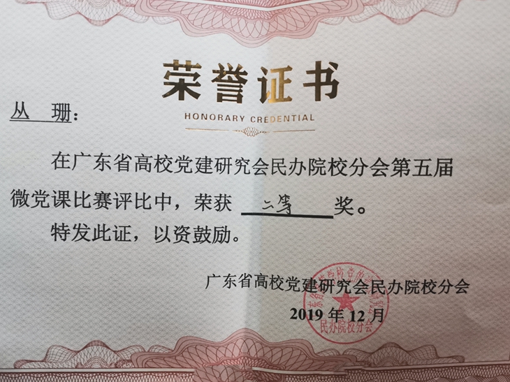 12月9日,广东省高校党建研究会民办院校分会2019年第五届微党课比赛(决赛)在广东岭南职业技术学院科技中心举行,法学院丛珊老师代表伟德官网参加决赛并荣获二等奖。