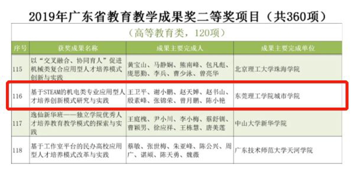 据介绍,《基于STEAM的机电类专业应用型人才培养创新模式研究与实践》项目针对民办本科院校机电类专业人才培养过程中存在的问题,研究提出了面向区域大制造业的机电类专业应用型人才培养创新模式,引入了STEAM教育理念,形成了一套基于STEAM的面向区域大制造业的机电类专业应用型人才培养创新模式。该项目成果提出了“三阶段、三目标”的课程群组教学模式,加强了学生机械设计基础,夯实了学生控制技术,同时建立了特色鲜明的“以工程应用能力为导向”的应用型人才培养体系,多层次、分阶段梯次推动课内外实践、实训教学,提升了学生创新能力及解决实际问题能力。该项目与东莞高技能实训中心、伟易达(东莞)电子产品有限公司深度合作,建立了“学校-政府-企业”协同育人的良好环境,实现了“校企互动、工学结合”。