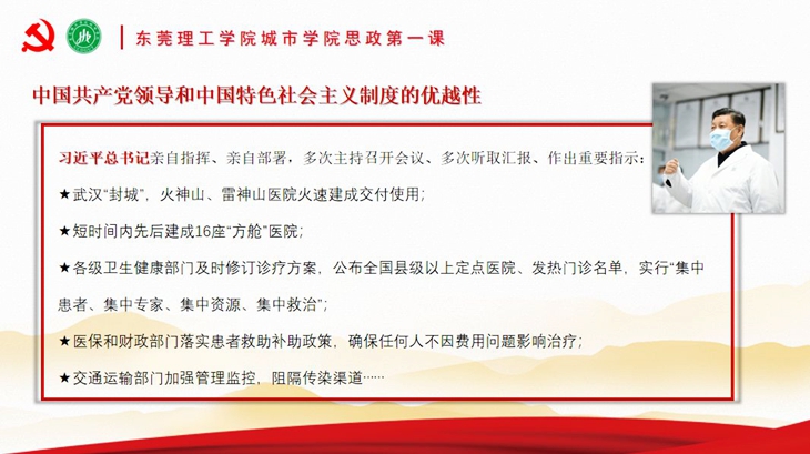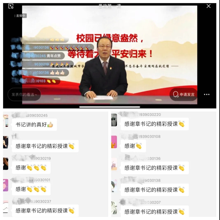 极富感染力的授课风格,动人肺腑的话语,贴近学生、贴近实际、贴近社会的选题,引起了学生们强烈共鸣。同学们纷纷表示,这堂特殊的思政课内容丰富、重点突出、视野开阔、讲解透彻,大家更加坚定了打赢这场疫情防控阻击战的信心。一位同学在留言中提到:“章书记的思政第一课使我很受启发。风雨如磐的党史无数次证明了中国共产党的伟大。在此紧要关头,中国共产党方显担当本色。作为一名新时代大学生,我将不断坚定‘四个自信’,传承战疫英雄们克险奋进、无私奉献的优良传统,奋力担当起时代赋予的光荣使命,书写无悔于国家和人民的青春华章。”