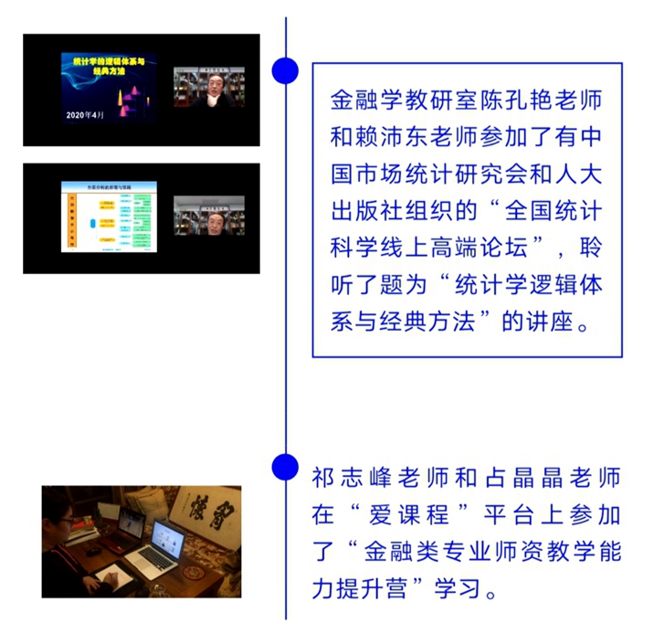 在疫情防控期间,金融与贸易学院根据学校的部署安排,全体教师积极探索,认真备课,保证全院线上教学活动顺利开展。与此同时,全院教师在院领导的带领下,由教研室主任带动老师在课余时间积极参加各类线上学习培训,努力提升自己,营造了浓郁的“停课不停教,停课不停学”学习氛围,在探索创建学习型组织的道路上更上一层楼。