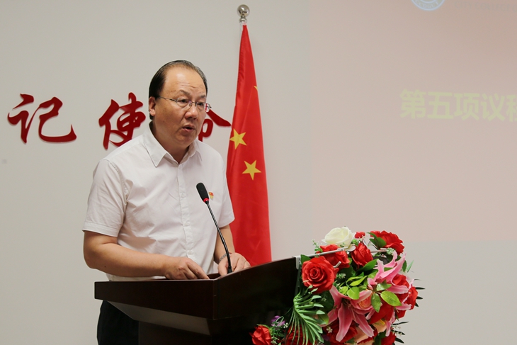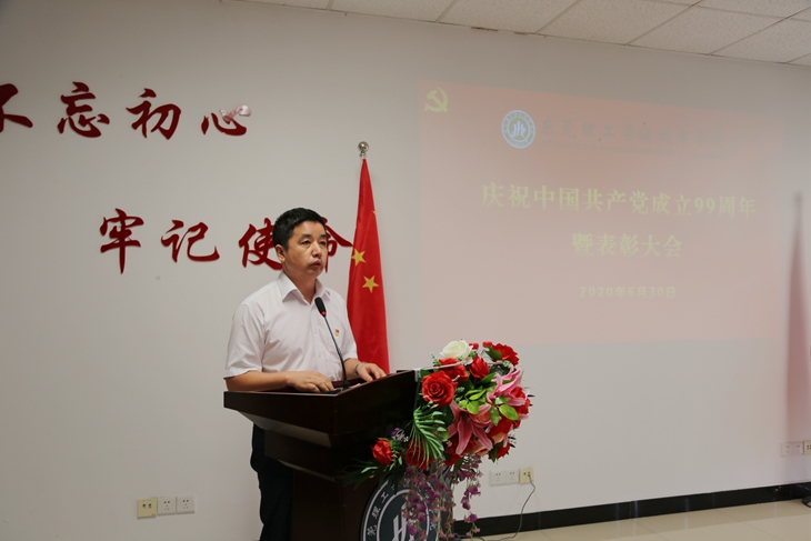 学校党委书记章德胜同志在大会上发表讲话,对受到表彰的集体和个人,表示热烈的祝贺和崇高的敬意!向推动学校各项事业健康发展的基层党组织和全体党员同志们,表示衷心的感谢!对全校党员干部提出四点希望:一是扎实做好常态化疫情防控工作。尤其是近期毕业生返校期间,既要保障师生的生命健康安全,又要体现党和学校的温暖,做好人文关怀,陪毕业生共同度过这段特殊的大学时光。二是夯实“不忘初心、牢记使命”主题教育成果,加强学习教育常态化建设。把学习教育落到实处,推动基层党建工作水平的持续提升。三是坚定不移,推动全面从严治党向纵深发展。各级党组织要把政治建设摆在首位,在务实功、求实效上下功夫,为学校各项事业发展提供坚强保障。四是高举社会主义旗帜,抓好思想政治教育。要求党员干部加强政治意识,守好意识形态阵地,让党旗始终高高飘扬在疫情防控、返校复学、事业发展的全过程。