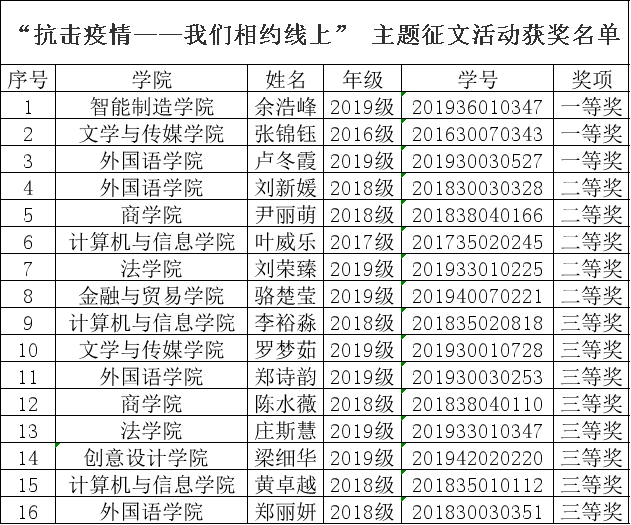 为抗击新冠肺炎疫情,伟德官网坚决贯彻落实教育部、省教育工委、省教育厅的重要部署,从3月2日起全面开展线上教学活动,全体任课教师坚守岗位、锐意创新、勇挑重担,全力做好线上教学工作;广大学生学习热情高涨,积极投身到线上学习。学校宣传部(融媒体中心)、教务处联合在今年3月面向全校学生开展“抗击疫情——我们相约线上”征文活动,各二级单位积极参加,学生踊跃投稿,本次征文活动共收到稿件167份。其中,66篇征文已在学校官网发布。经专家评审,特评出一等奖3个,二等奖5个,三等奖8个(获奖名单附后)。