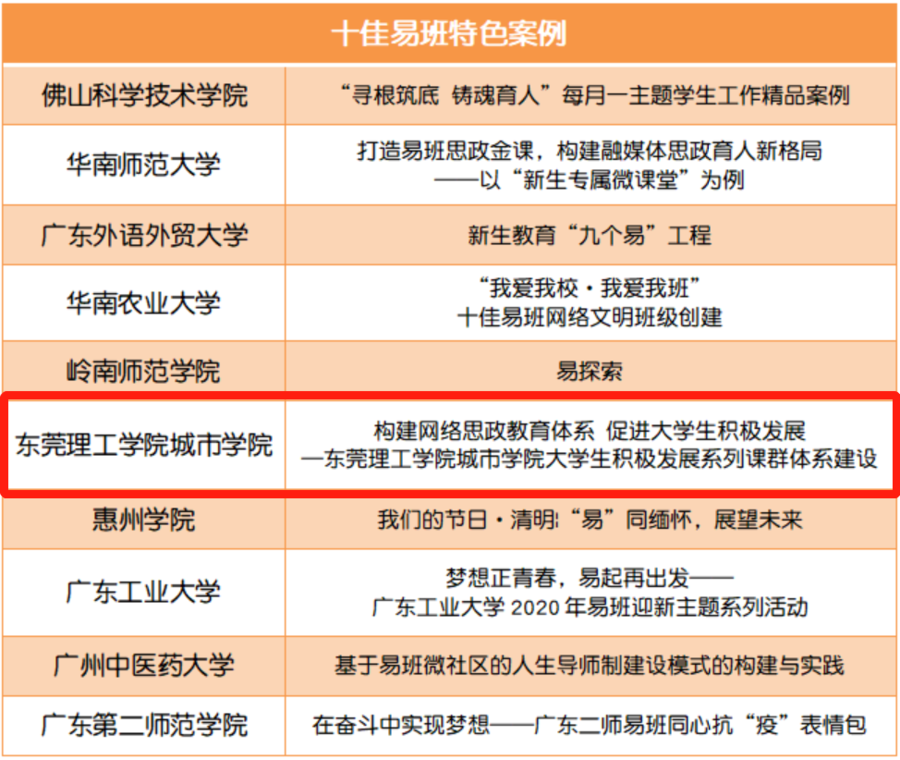 11月13日晚上,“勇立潮头 开拓进取”——2020年广东高校学生工作成果展示活动在广东工业大学大学城校区隆重举行。伟德官网詹海都老师荣获2020年度本科组广东高校十佳易班指导老师荣誉称号,伟德官网《构建网络思政教育体系 促进大学生积极发展——东莞理工学院城市学院大学生积极发展系列课群体系建设》荣获2020年度本科组广东高校十佳易班特色案例,充分展现伟德官网网络育人工作的水平和成效。