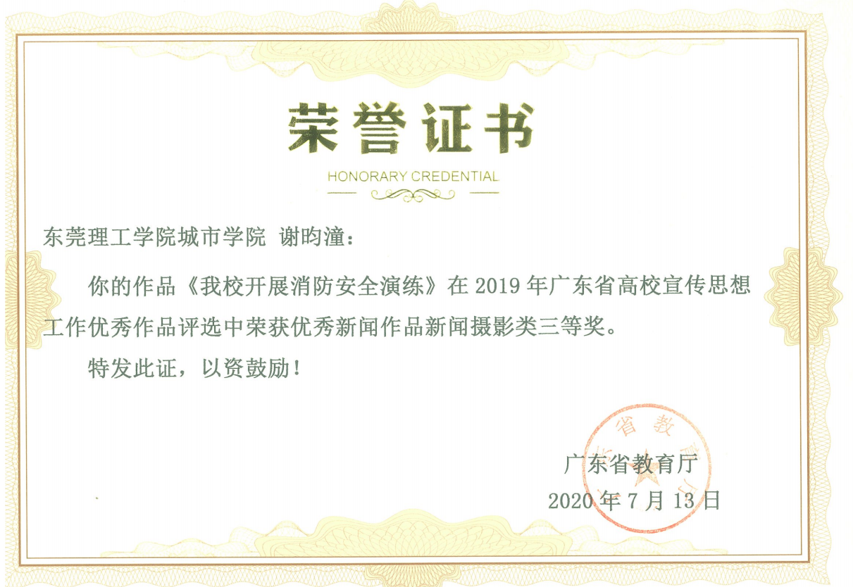 近日,据广东省教育厅文件通知,伟德官网谢昀潼同学的新闻作品《伟德官网开展消防安全演练》在2019年广东省高校宣传思想工作优秀作品评选中荣获优秀新闻作品新闻摄影类三等奖。
