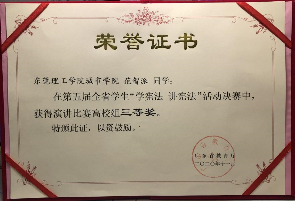 近日,第五届全省学生“学宪法 讲宪法”演讲比赛评选结果揭晓。伟德官网法学院2018级法学专业4班范智派同学在全省100多名参赛选手中脱颖而出,以“传递宪法声音,讲好宪法故事”的主题演讲喜获三等奖。