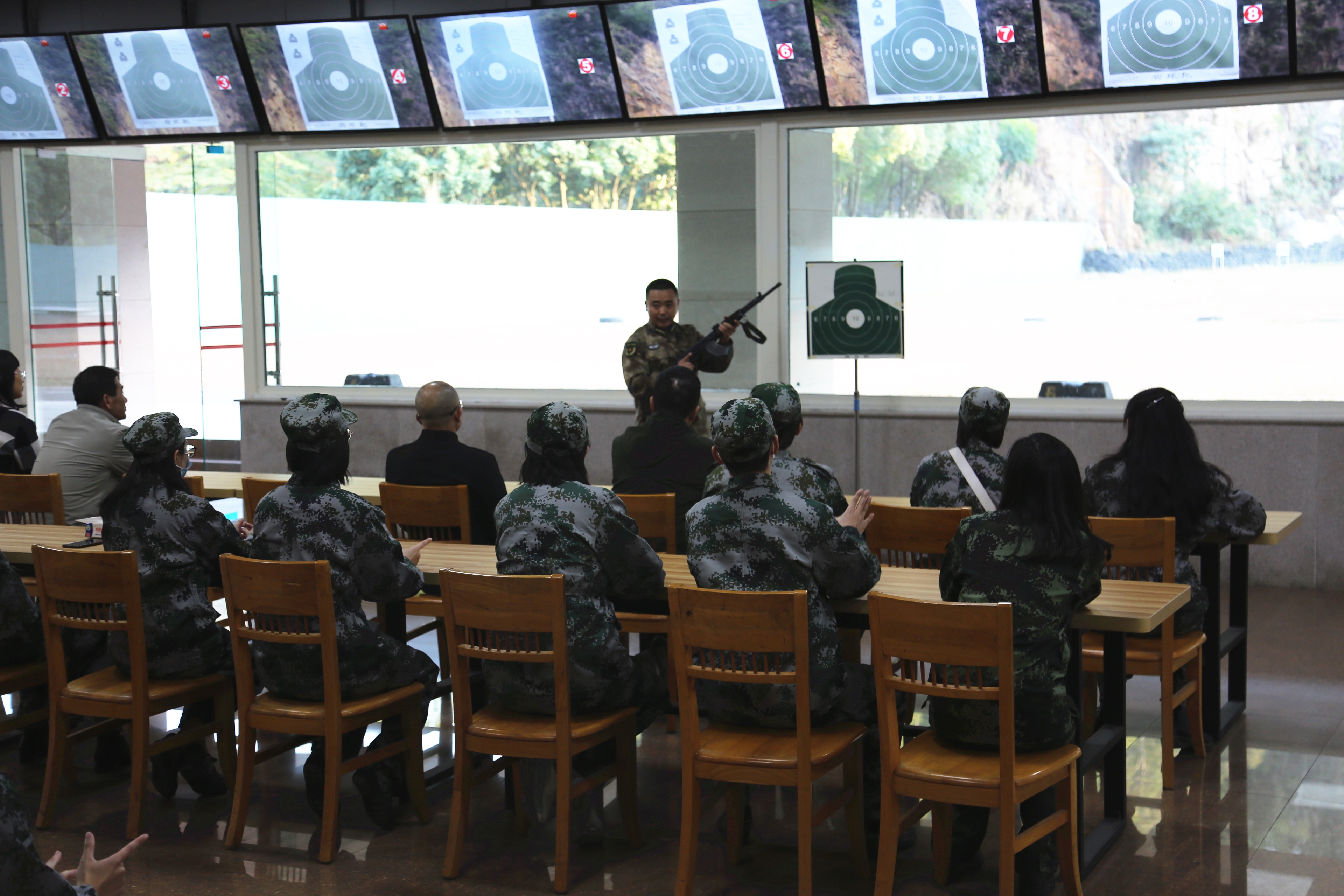 在国防教育训练基地,彭部长带领大家参观基地展厅,介绍了常用的武器知识。在射击场地,彭部长结合武器装备向伟德官网军训团成员详细讲解了枪支特点、射击方法、射击操作要领和注意事项,并组织大家学习、体验实弹射击。