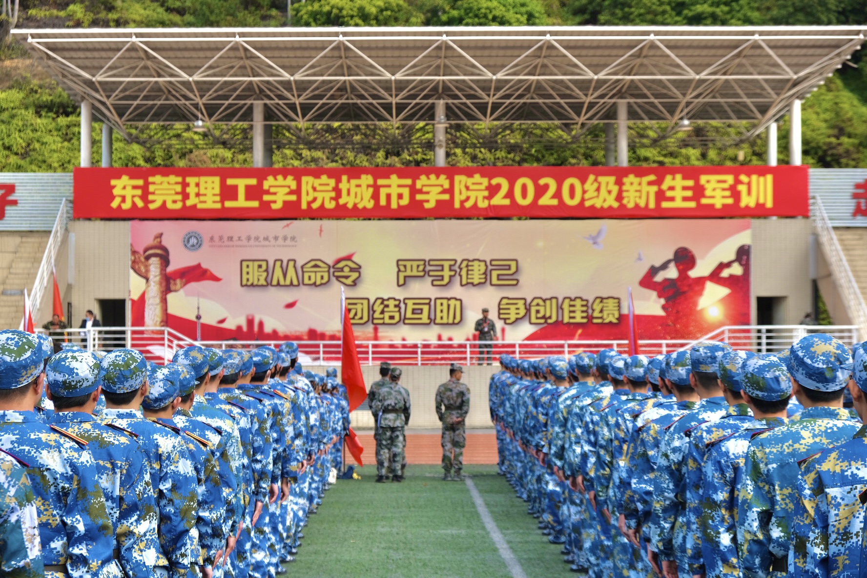 1月4日下午,伟德官网在运动场隆重举行2020级大一学生军训开训仪式,2500余名学生将参加为期14天的军训,锻造品质,磨砺自我。东莞市国防教育训练基地主任林东生、训练部部长彭亮,学校校长王卫平、党委书记章德胜、副校长高香林、广东鸿发教育集团公司副总经理李奎山等领导,以及军训团成员,各营、连、排军训教官及指导员出席开训仪式。