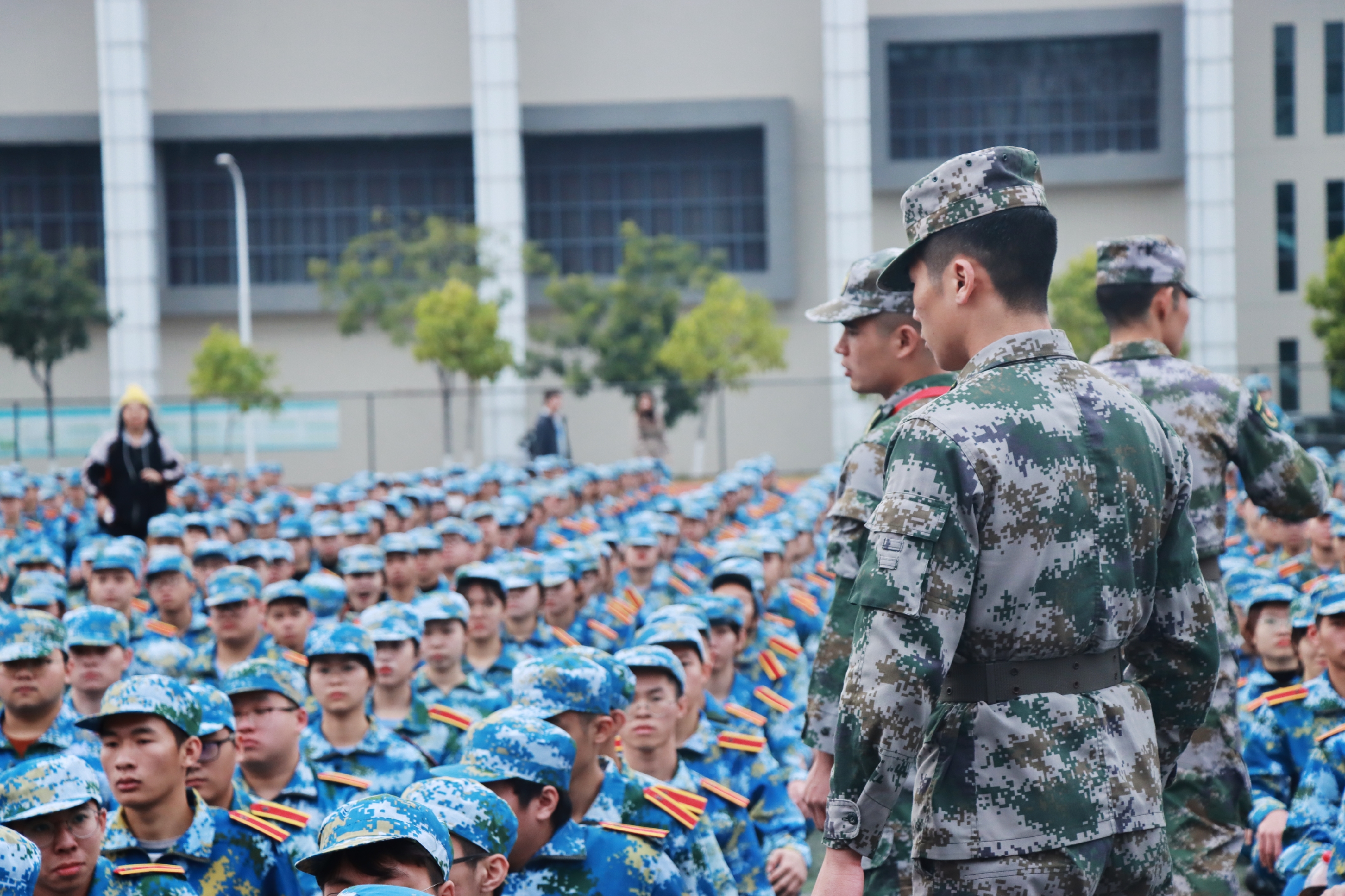 仪式上,王卫平校长向林东生主任授“东莞理工学院城市学院军训团”团旗,拉开军训大幕。各连教官踏着整齐的步伐入场,带领连队进行军训前的热身训练。