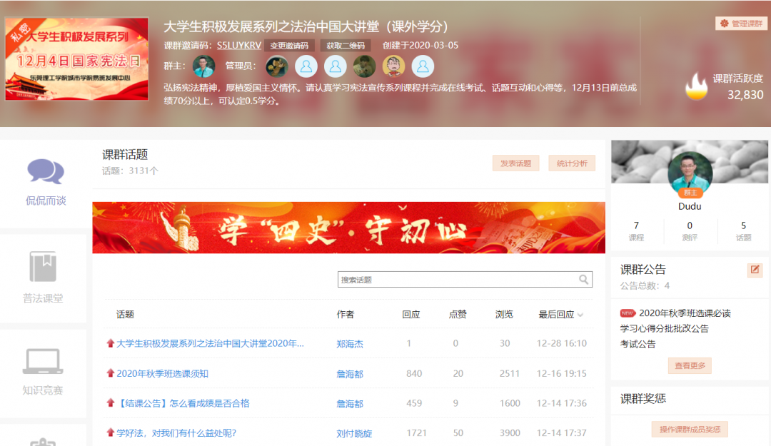 自2018年6月创建首个新生入学前教育课群开始,伟德官网积极探索易班优课课群在网络思想政治教育中的运用。开始开展新生入学前教育和在线迎新活动,目前已经覆盖了2018、2019、2020三个年级共计15592人,累计课群活跃度275379。经过三批次学生的实践探讨,积累了丰富的经验,也形成了稳定的模式。其次,积极探索大学生积极发展系列课群体系建设,构建了新生入学前教育、毕业生教育、日常主题教育系列课群体系,构建了完整的日常思想政治教育课程体系。此外,校易班发展中心还积极推动易班优课在党建、人事招聘培训、军事理论教育、学生日常管理等方面的运用。