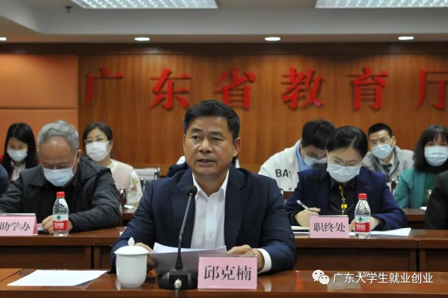 省教育厅二级巡视员邱克楠在会议指出,疫情常态化下,就业形势复杂严峻,就业工作任务艰巨。一是毕业生数量再创新高。今年,全国高校应届毕业生总规模预计将达909万,同比增加35万,我省高校应届毕业生人数约有64.2万,比去年增加3.9万,加上外省入粤和留学回国求职的毕业生,在粤求职的毕业生将超过85万。二是新就业岗位供给面临挑战。据全国调查,有四成的高校反映校园招聘岗位数量同比有所减少,根据人社部门统计,市场岗位同比减少两成。三是慢就业现象突出。有业不就和无业可就的情况都比较突出。充分认清就业工作面临的严峻挑战,增强紧迫感,把高校毕业生就业这项工作谋划好和抓起来。他在会议上要求各高校,一是要积极拓展政策性岗位;二大力拓展市场化岗位;三提升就业指导服务水平。最后他强调各高校要成立就业工作领导小组,落实就业机构、人员、场地、经费“四到位”要求,保障就业顺利开展。统筹各相关职能部门加强沟通协调,分管校领导亲自抓,统筹做好稳就业工作,强化一盘棋观念,切实做到统筹推进就业工作重点任务,协同开展工作。