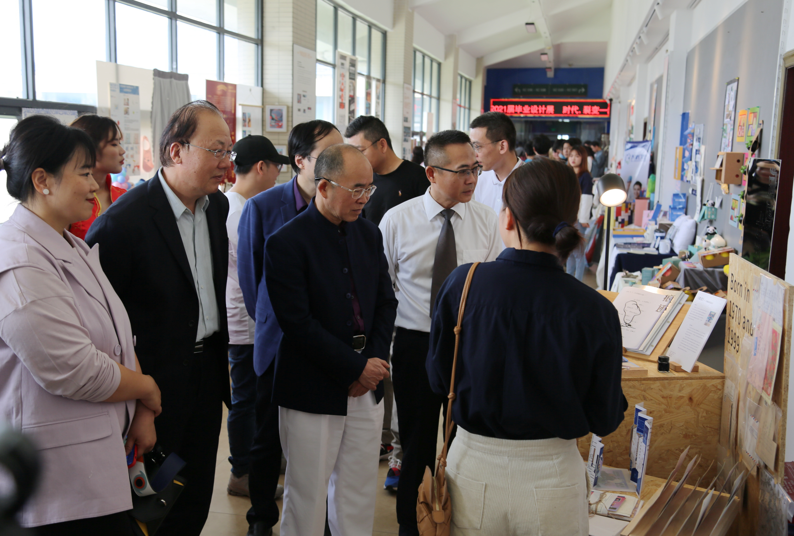 随后,领导嘉宾一同参观了毕业设计展。展览主题为“时代·裂变”,意在让处在这个不停变革之中的新一代大学生,用包含创意和艺术感的作品迎接时代的挑战,将新的思维和观点融入商业或公益设计,展示出设计专业大学生对时代变革的最强回响。