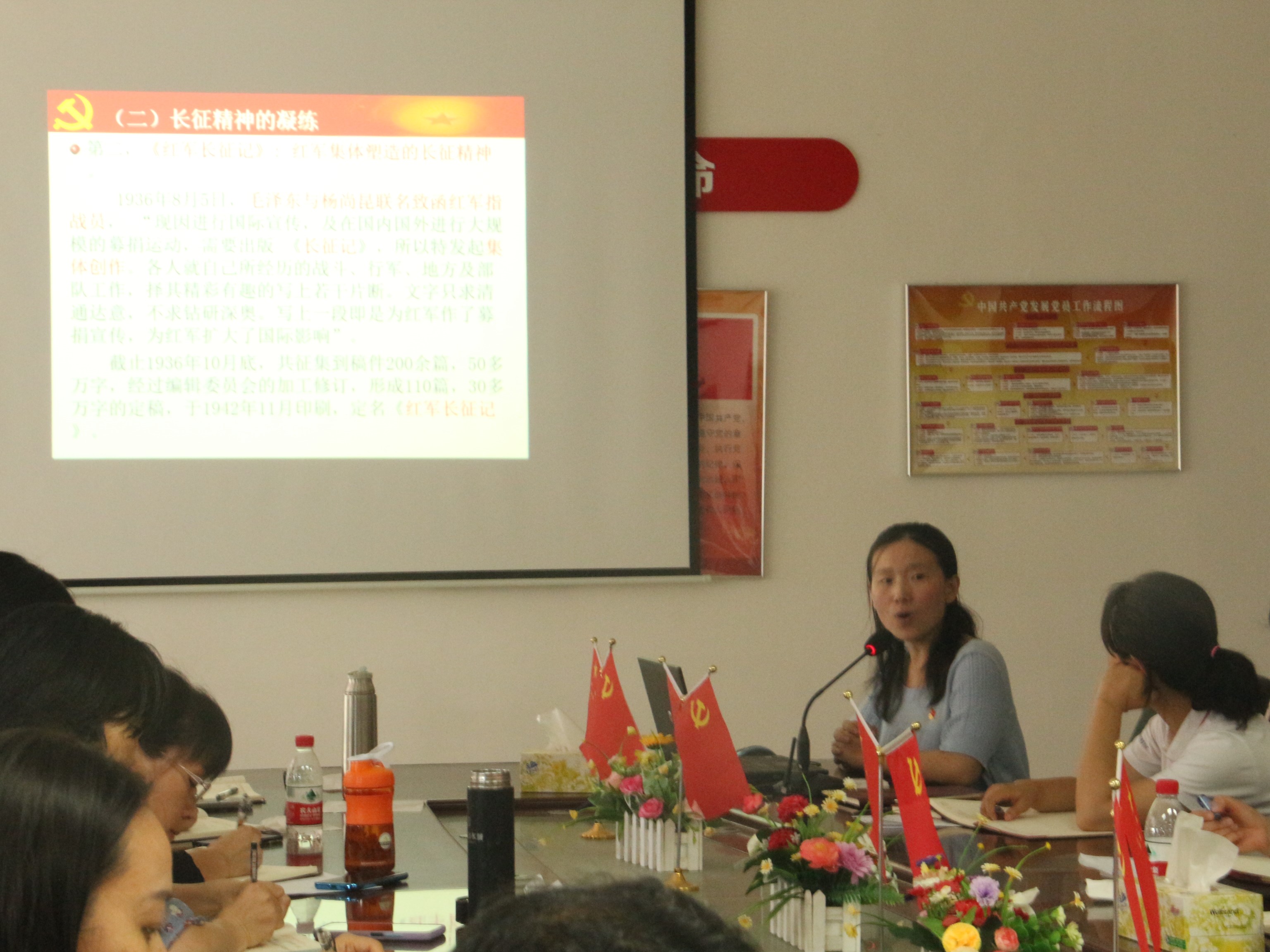 为了进一步推动形成浓厚党史学习氛围,将学习推向深入,马克思主义学院在做好外部宣讲的同时,内部党史学习交流也依计划有序进行。5月13日下午,围绕党的精神谱系重要组成部分长征精神,党支部书记史雍真和吕海红副教授分别以《长征精神与精神长征》《革命理想高于天——鉴赏<长征组歌>重温长征精神》为题作阐释,分享了个人见解和体会。