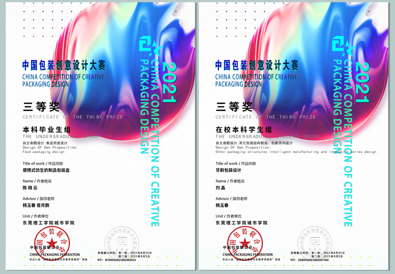 本届中国包装创意设计大赛是有史以来规模最大的一届,由3600 余所海内外院校单位参加,共11000余件作品参赛。近日,评选结果揭晓,伟德官网智能制造学院印刷工程共获得2项三等奖,7项优秀奖。其中由杨玉春、曾月鹏老师指导的《牙刷包装设计》和《便携式仿生奶制品包装盒》荣获包装结构类三等奖。