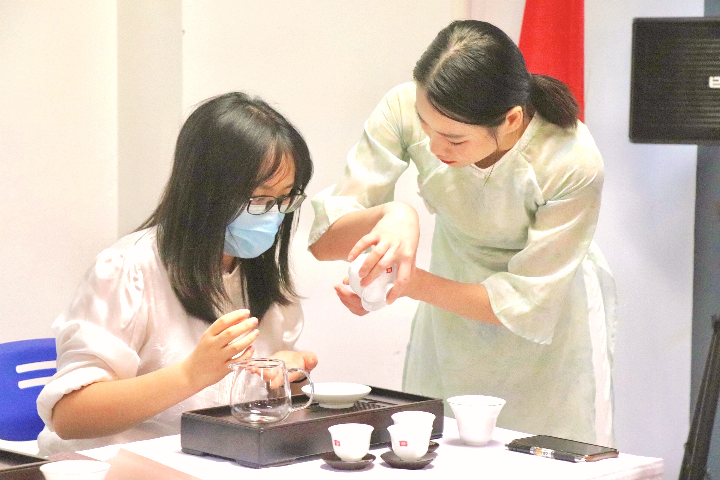 随后梁玉婷老师还进行了茶艺赏析。对茶具作了展示与介绍,茶艺师演示泡茶的流程、行茶的正确姿势和注水方式。茶不仅是生活中的饮品,也是社交的重要方式,蕴含着茶桌礼仪,在礼仪上,倒茶需遵循茶倒七分满,喝茶应遵循伸掌礼与叩手礼。