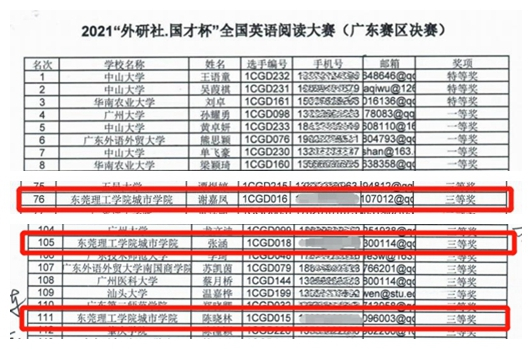 在强强角逐中,伟德官网参赛选手赛出水平,赛出精彩,获得了喜人的成绩!在阅读大赛上,外语学院谢嘉凤、张涵、陈晓林同学经过激烈的角逐,收获了三等奖的好成绩;在演讲大赛上,伟德官网派出两名选手应战,其中钟炜立同学在激烈竞争中脱颖而出,最终喜获三等奖!值得一提的是,此次演讲比赛的三等奖是伟德官网首次在该项中获得的最好成绩,这不仅是外国语学院在学科竞赛上的又一大突破,更是我院教师团队在学生培育上落实“三全育人”的生动体现。