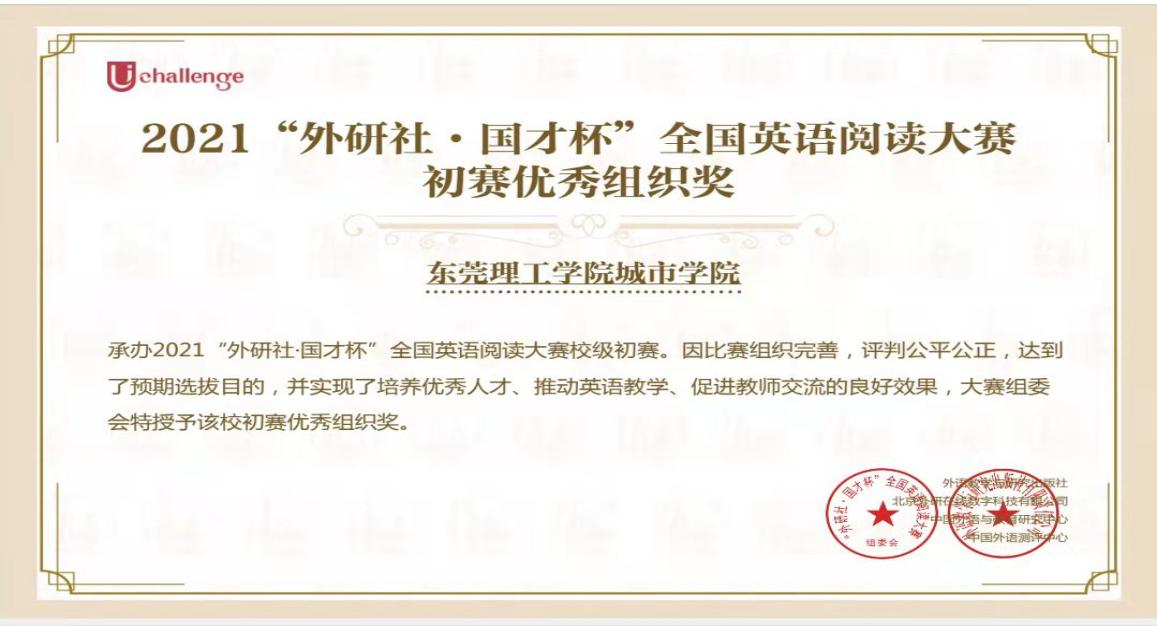 从初赛起,外国语学院高度重视此次比赛,积极有序组织学生参赛,评判公平公正,并为学校分别收获了大赛组委会授予的阅读大赛初赛和写作大赛初赛的优秀组织奖两个,充分展现了外语学院师生团结协作、勇往直前、共同奋进的精神风貌!