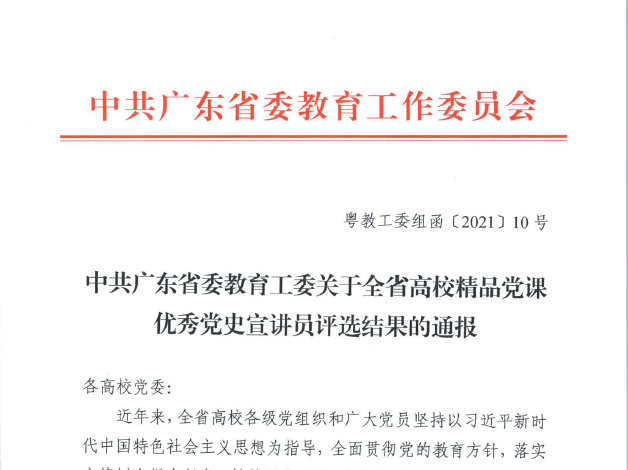 此次全省高校精品党课优秀党史宣讲员评选活动推动了精品党课和党史宣讲进校园,教育引导广大党员干部传承红色基因、赓续红色血脉,不忘初心、牢记使命,立足本职岗位作贡献,落实立德树人根本任务,办好人民满意的教育,为推动广东在全面建设社会主义现代化国家新征程中走在全国前列、创造新的辉煌不懈奋斗。