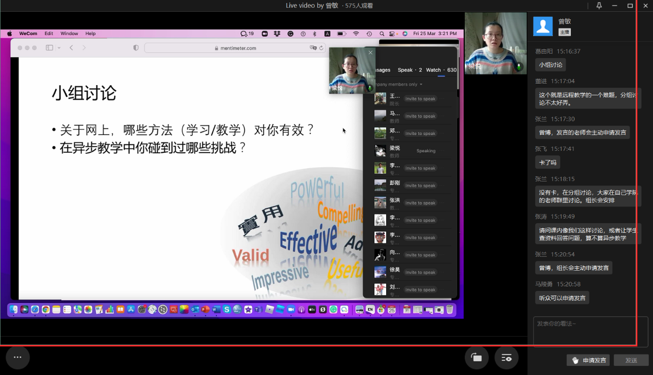 3月25日下午,“新教师•新方向•新提升”线上教学能力提升第一期工作坊在线上举行。香港大学教与学促进中心曾敏博士做“鼓励网络异步教学中学生的主动学习”讲座,伟德官网专任教师以及相关部门人员600余人齐聚直播间,聆听专家的经验交流和分享。