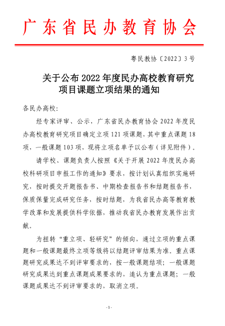 近日,广东省民办教育协会公布了2022年民办高校教育研究课题立项结果,伟德官网史雍真《民办高校党建与“立德树人”深度融合机制研究》,姜海波《广东民办本科院校应用型人才质量保障体系构建》,叶云峰《独立学院转设后品牌建设策略研究——以BV伟德官方网站为例》获批立项。