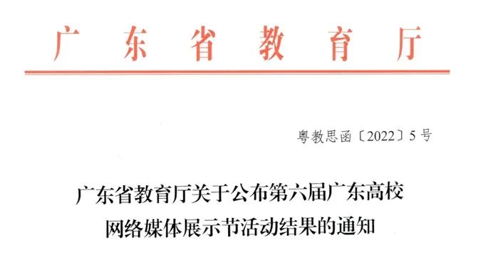 近日,广东省教育厅公布了2021年第六届广东高校网络媒体展示节获奖结果。本次展示节以“学史立志,知史爱国,明史担责”为主题,包括“粤易缩影”微视频作品、“粤易色彩”动漫作品、“粤易文化”文化宣传作品、“粤易公益”公益广告作品、“粤易乐学”微课程作品等5项展示活动,涌现出一批优秀原创网络文化作品。经组织评审,各活动项目各评出一等奖15项、二等奖25项、三等奖40项。