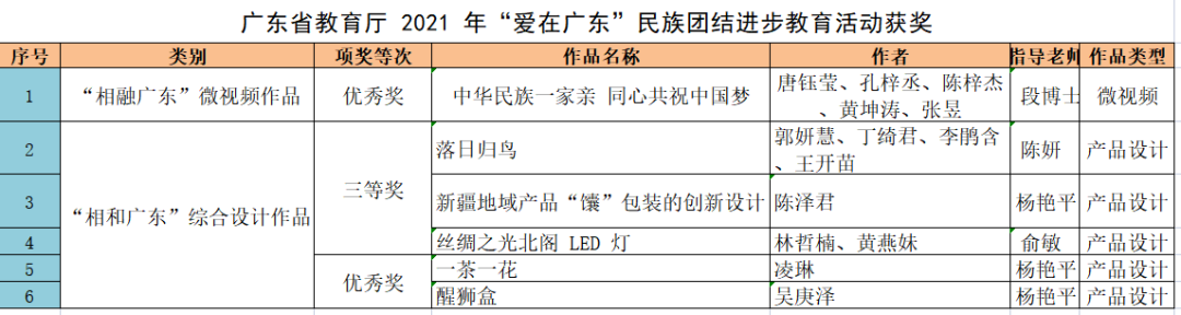 近日,广东省教育发布了 2021 年“爱在广东”民族团结进步教育活动通知,伟德官网在 “相和广东”综合设计作品和“相融广东”微视频作品两个类别中,共获得6个奖项。由郭妍慧、陈泽君、林哲楠等同学所在的团队的3个作品《落日归鸟 》《新疆地域产品“馕”包装的创新设计》《丝绸之光北阁 LED 灯 》获得三等奖,而唐钰莹、凌琳、吴庚泽等同学所在团队的3个作品《中华民族一家亲 同心共祝中国梦 》《一茶一花》《醒狮盒》获得优秀奖。